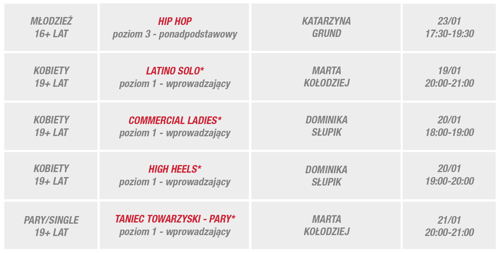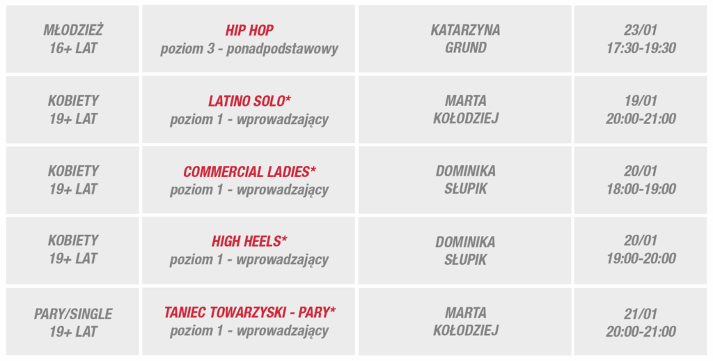 Zapraszamy w wybrane dni tygodnia 19-25 stycznia do Egurrola Dance Studio – Katowice, Silesia City Center, poziom +1, ul. Chorzowska 107.