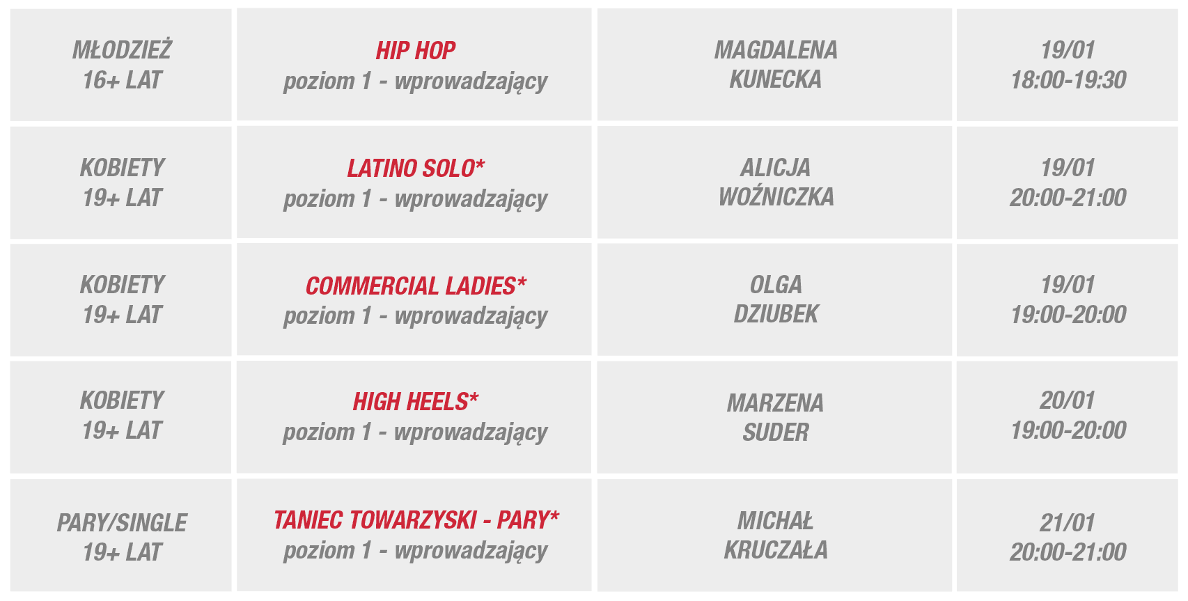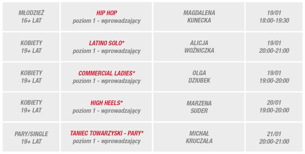 Zapraszamy w wybrane dni tygodnia 19-25 stycznia do Egurrola Dance Studio – Kraków, Galeria Kazimierz, ul. Podgórska 34.