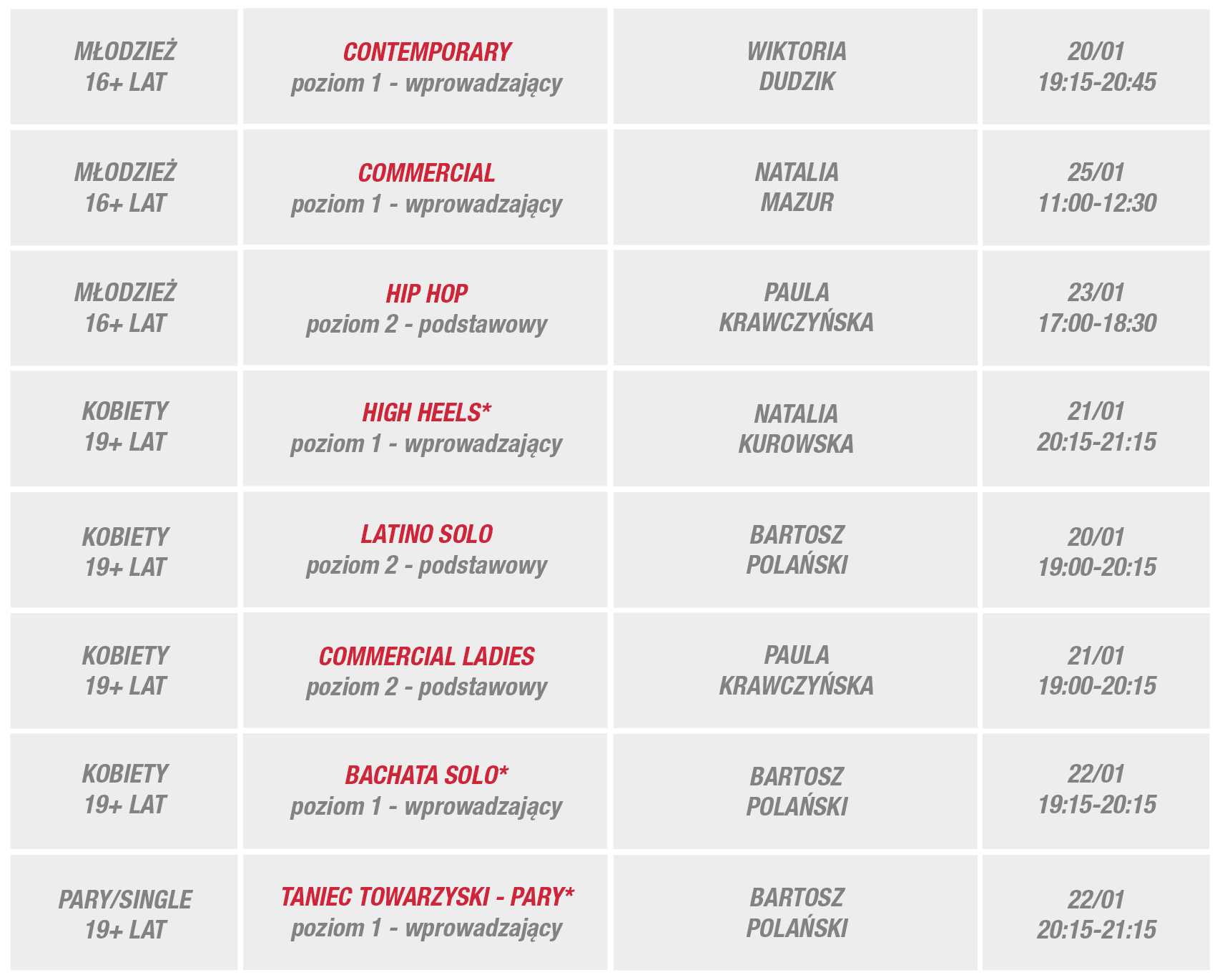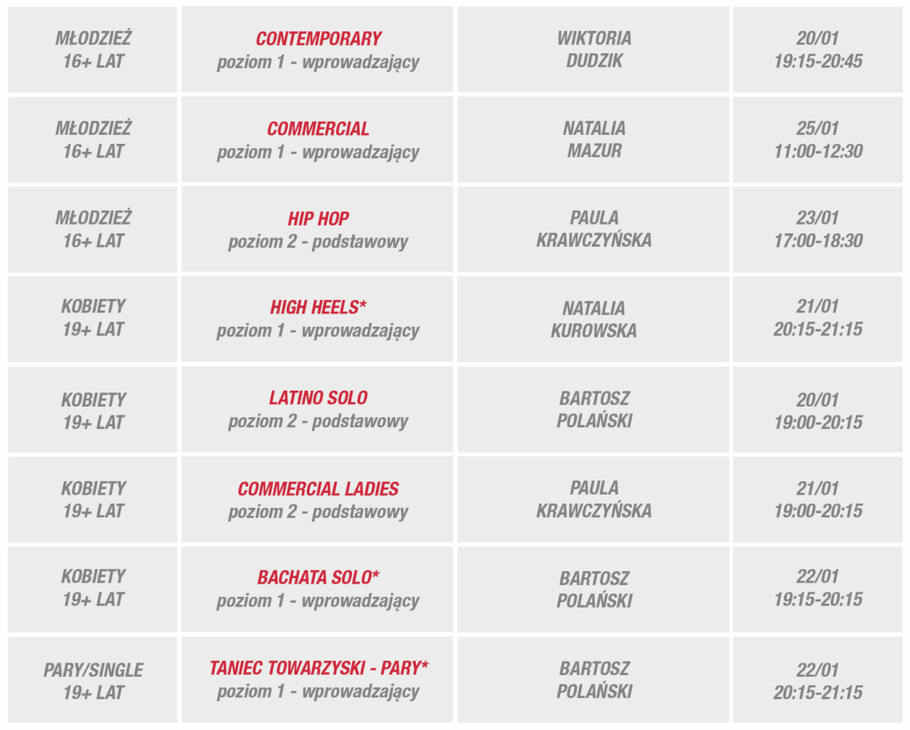 Zapraszamy w wybrane dni tygodnia 19-25 stycznia do Egurrola Dance Studio – Wrocław, Sky Tower, poziom +2, ul. Powstańców Śląskich 95.