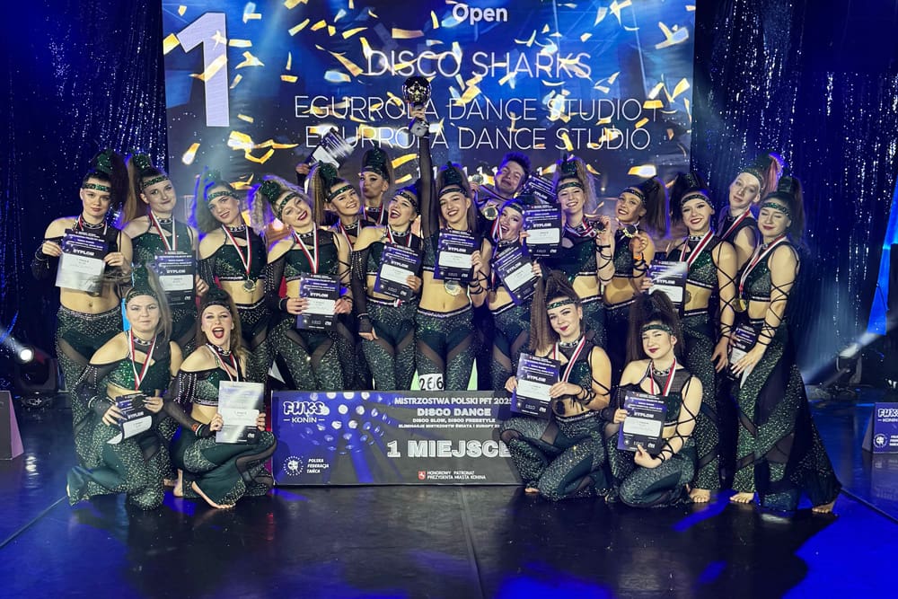 Disco Sharks to młodzieżowy zespół disco dance który od września 2025 trenuje w Egurrola Dance Studio Ochota pod okiem pani Mai Klimaszewskiej.