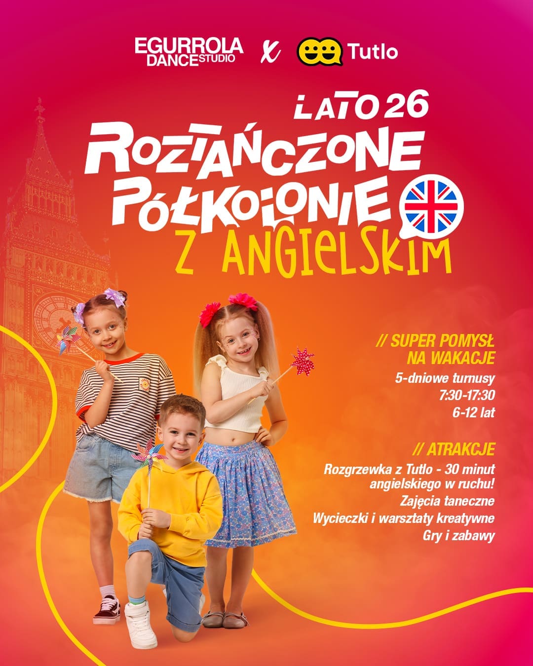 Każdy turnus to 5 dni (7:30-17:30) wypełnionych tańcem, nauką angielskiego z TUTLO oraz wieloma innymi atrakcjami, dzięki którym Twoja pociecha przeżyje niezapomniane chwile!