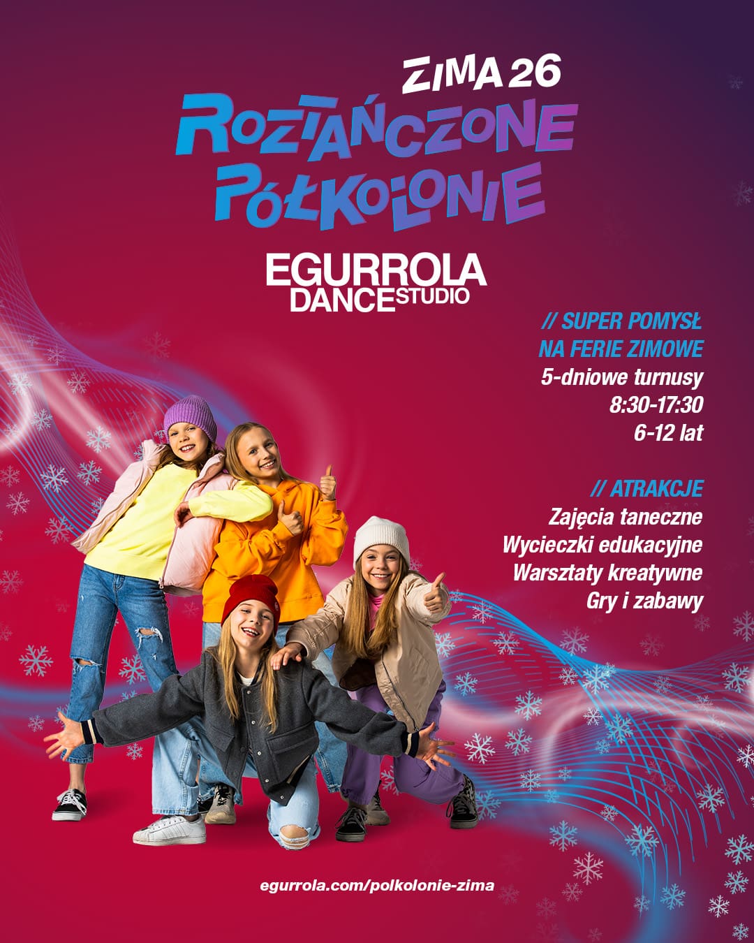 Każdy turnus to 5 dni wypełnionych tańcem oraz wieloma innymi atrakcjami, dzięki którym Twoja pociecha będzie miała niezapomniane ferie zimowe!