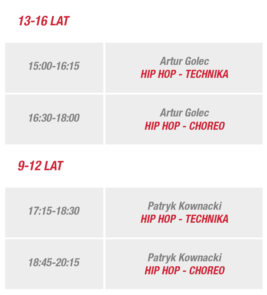 Członków naszych streetowych zespołów – dziecięcych i juniorskich oraz wszystkich innych tancerzy z kategorii wiekowych 9-12 i 13-16 lat, którym zależy na kompleksowym rozwoju swoich umiejętności pod okiem doświadczonych trenerów i jak najlepszym przygotowaniu się do zbliżających turniejów.