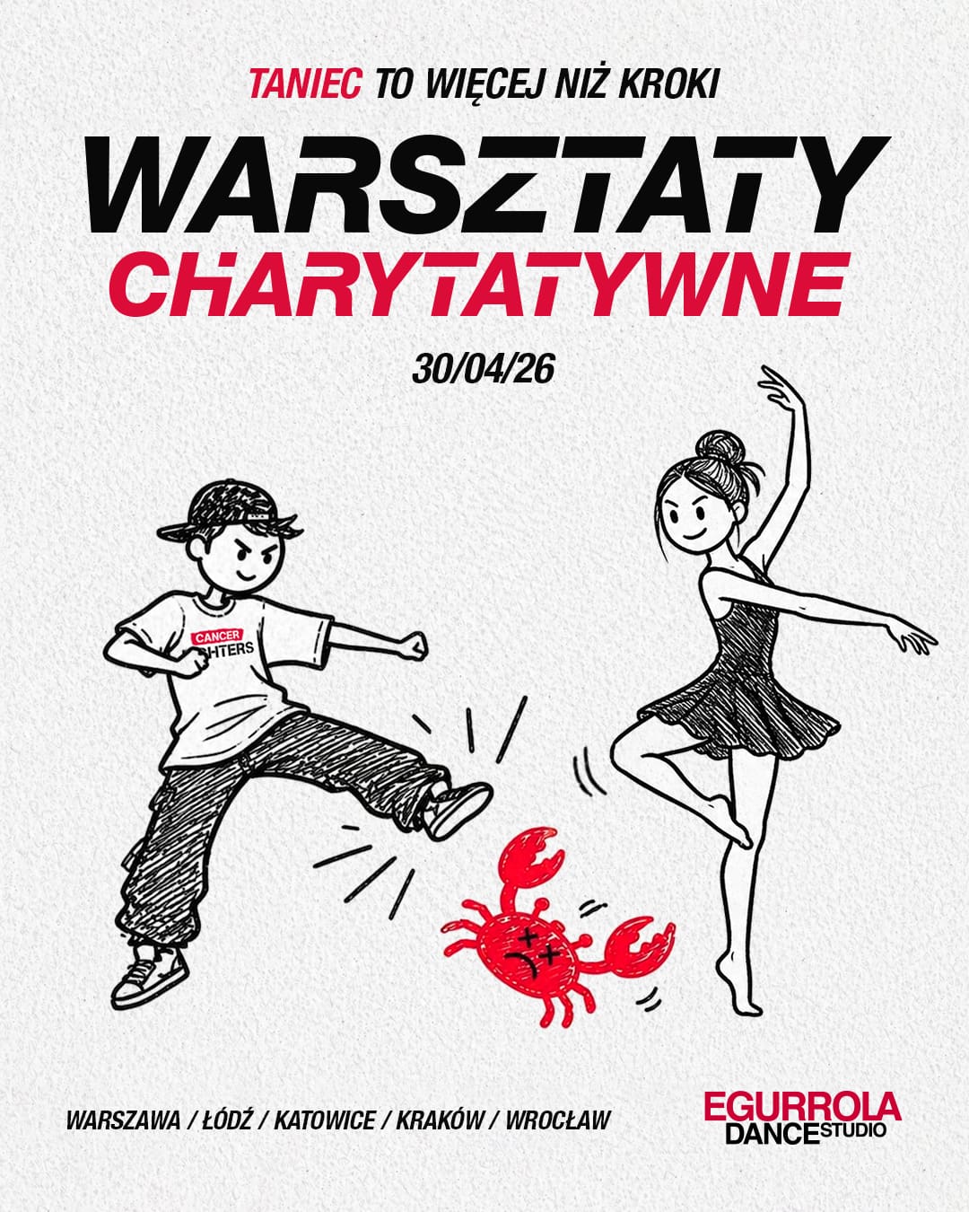 Już 30 kwietnia zapraszamy do naszych szkół w Warszawie Łodzi, Krakowie, Wrocławiu i Katowicach na charytatywne warsztaty taneczne, z których cały dochód przeznaczmy na fundację Cancer Fighters!