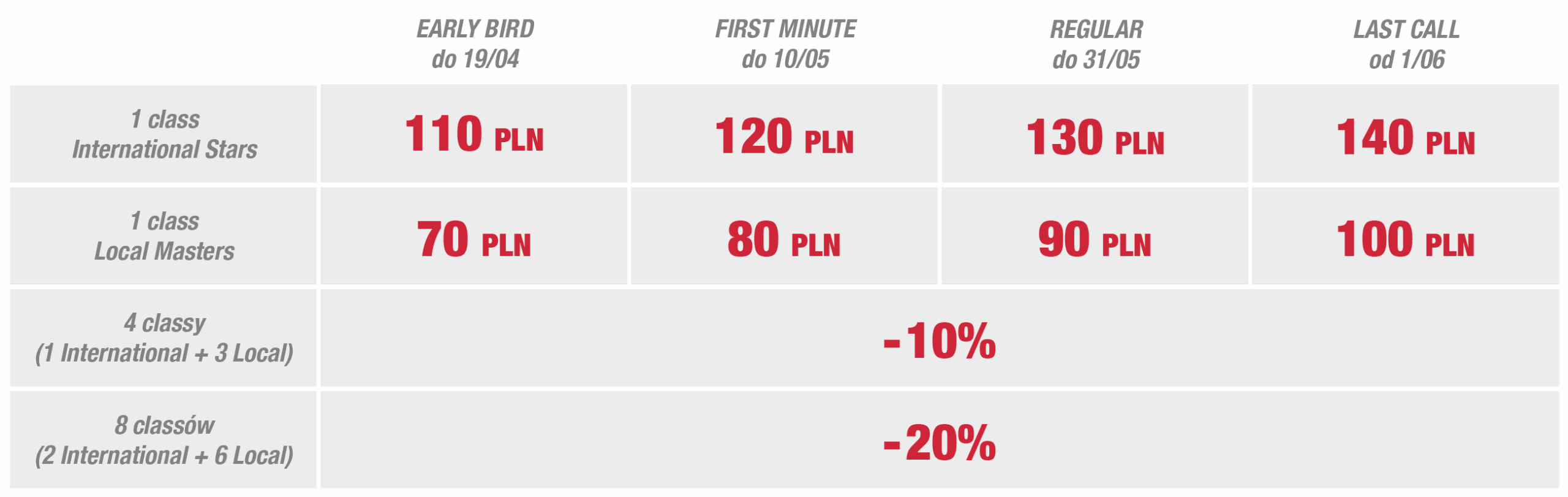 Nasze warsztaty to 4 strefy tańca, a w każdej z nich czeka na Ciebie międzynarodowy skład choreografów: 3 instruktorów z Polski i jedna zagraniczna gwiazda: