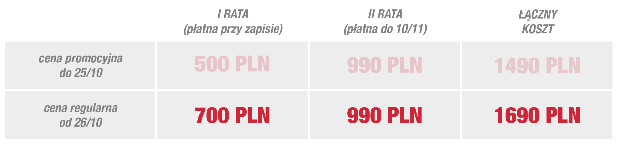 Wykonując przelew w tytule należy podać: imię i nazwisko uczestnika, nazwę wydarzenia oraz NUMER TELEFONU KONTAKTOWEGO.