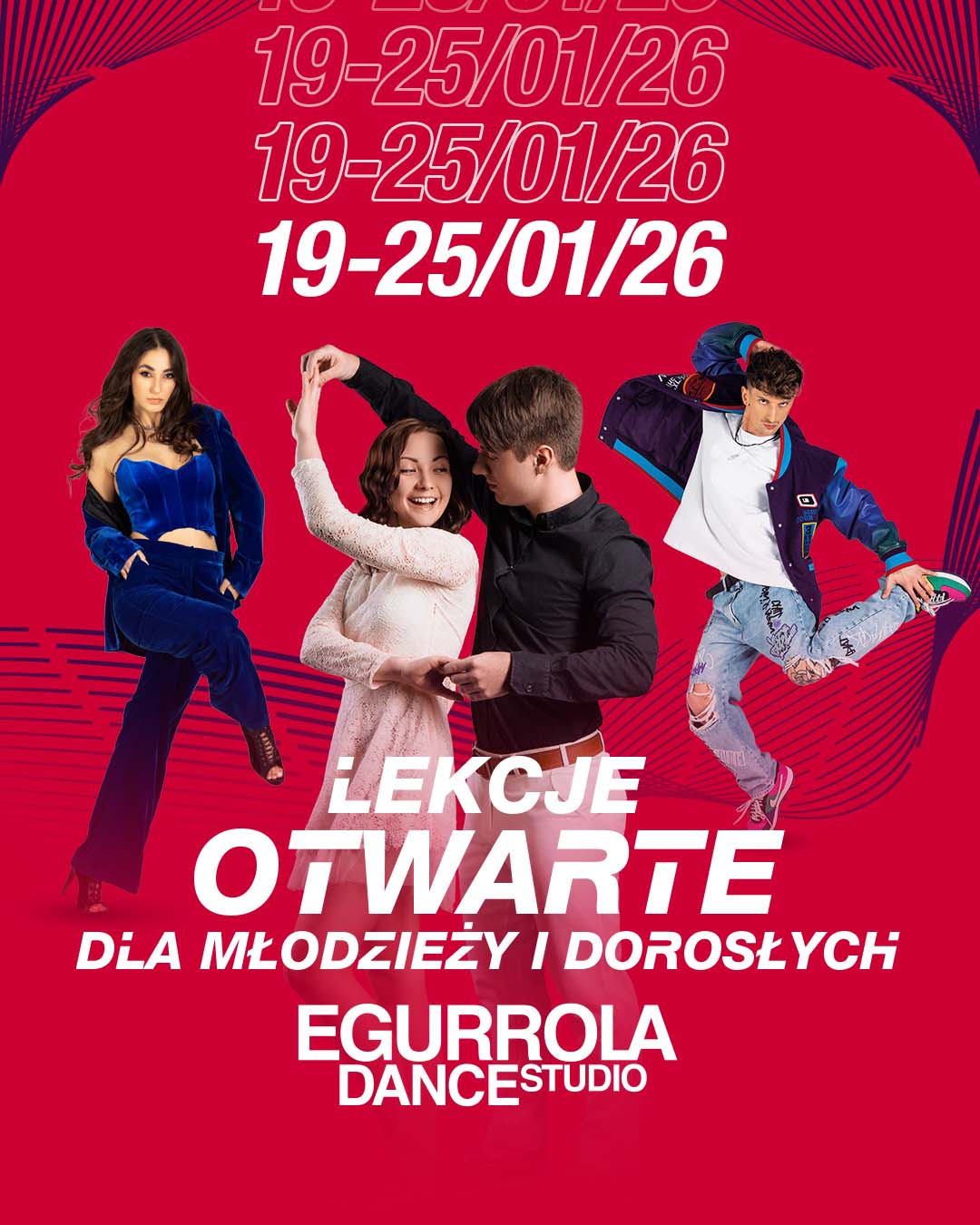 A już w wybranych dniach tygodnia 12-18 stycznia możesz wziąć udział w bezpłatnych lekcjach otwartych, podczas których poznasz naszą szkołę i instruktorów oraz zapoznasz się z wybranym stylem tańca.