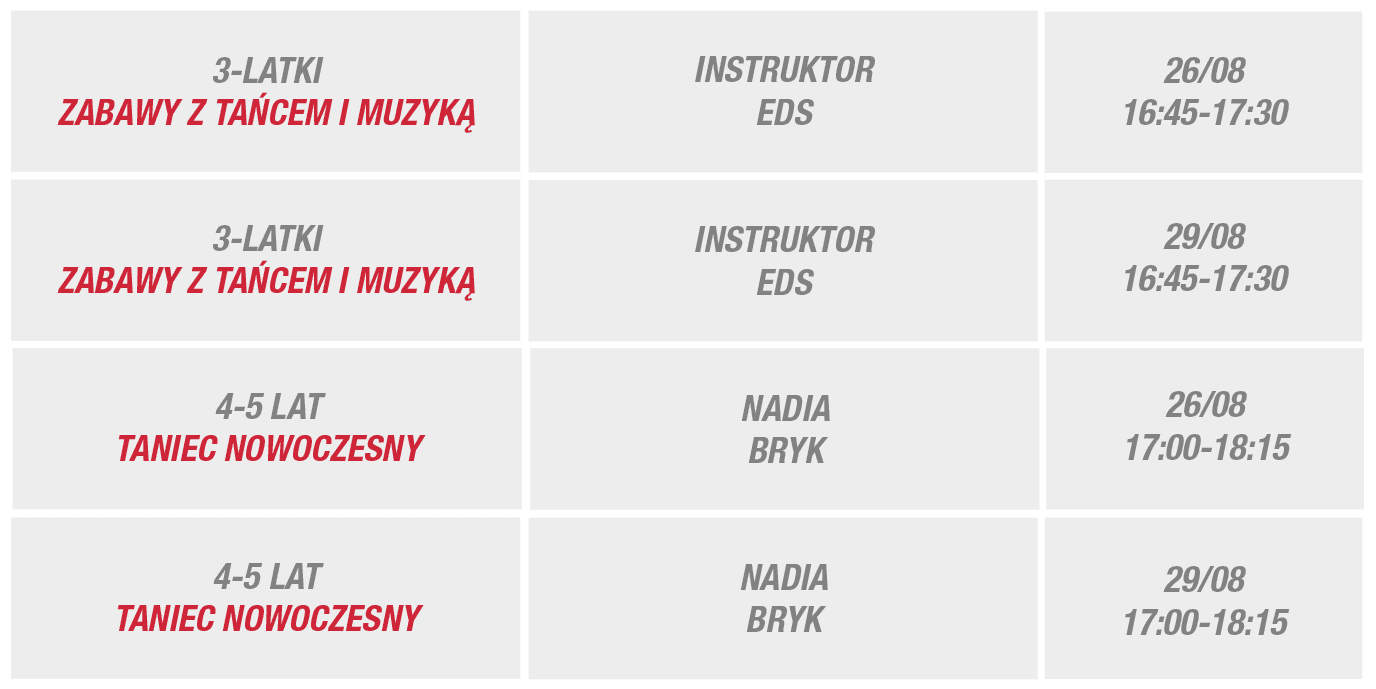 Zajęcia w ramach tygodnia adaptacyjnego odbędą się w Egurrola Dance Studio – Kraków, Galeria Kazimierz, ul. Podgórska 34.