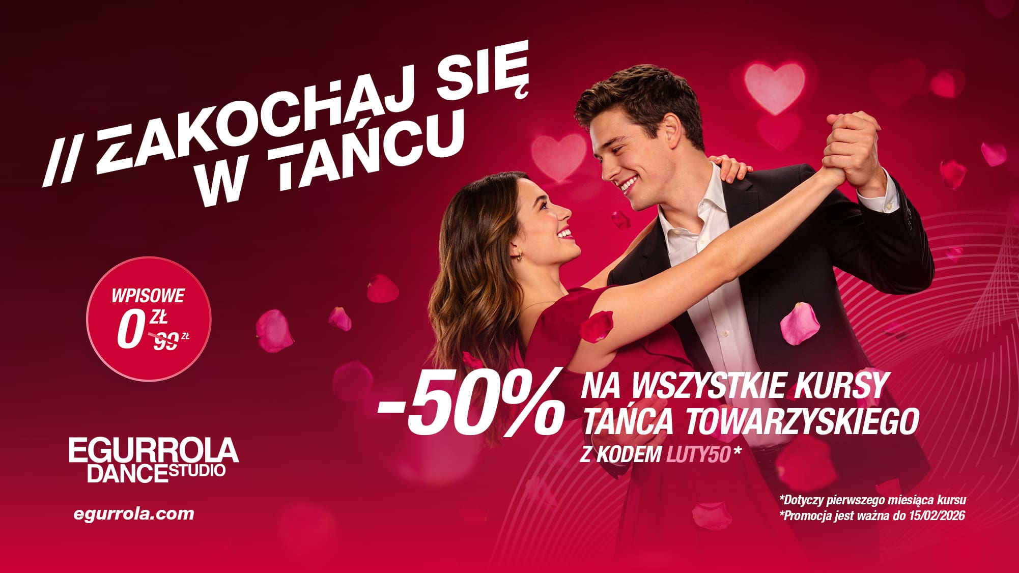 Aby nauka stała się jeszcze przyjemniejsza, tylko w dniach 7-15 lutego 2026 r. z kodem LUTY50 mamy dla Ciebie wyjątkową promocję – 50% na dowolny kurs tańca towarzyskiego w parach lub dla singli!*